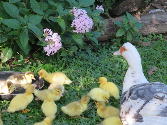 ところでこのアヒルの母親ですが、本能とはいえ、約30日も卵を抱き、孵ってからは成長に従い、少しずつ行動半径を広げ、水浴びを覚えさせたり、危ない目に合わないように、ヒヨコ達のチョコチョコ遊ぶ様子を注意してみていたりと、その面倒見のマメさには何と健気なことよ、と見ていて愛おしくなります。